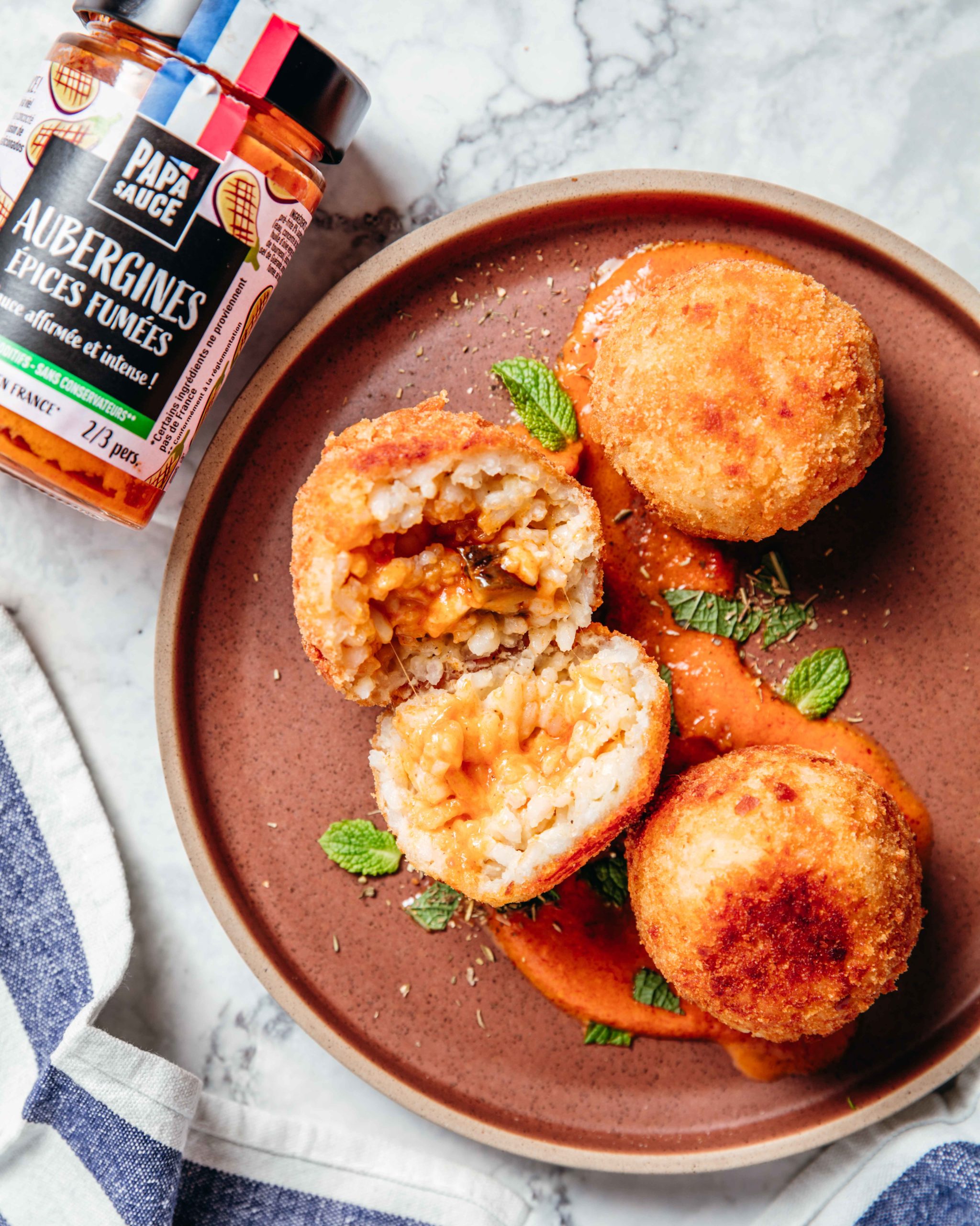 - Pour la formation des boulettes, humidifiez vos mains, prenez le riz dans le creux de la main et creusez un trou, ajouter la Papa Sauce Aubergines & Epices fumées, des cubes d’aubergines et des cubes de mozzarella (quantité à votre convenance et selon votre gourmandise).