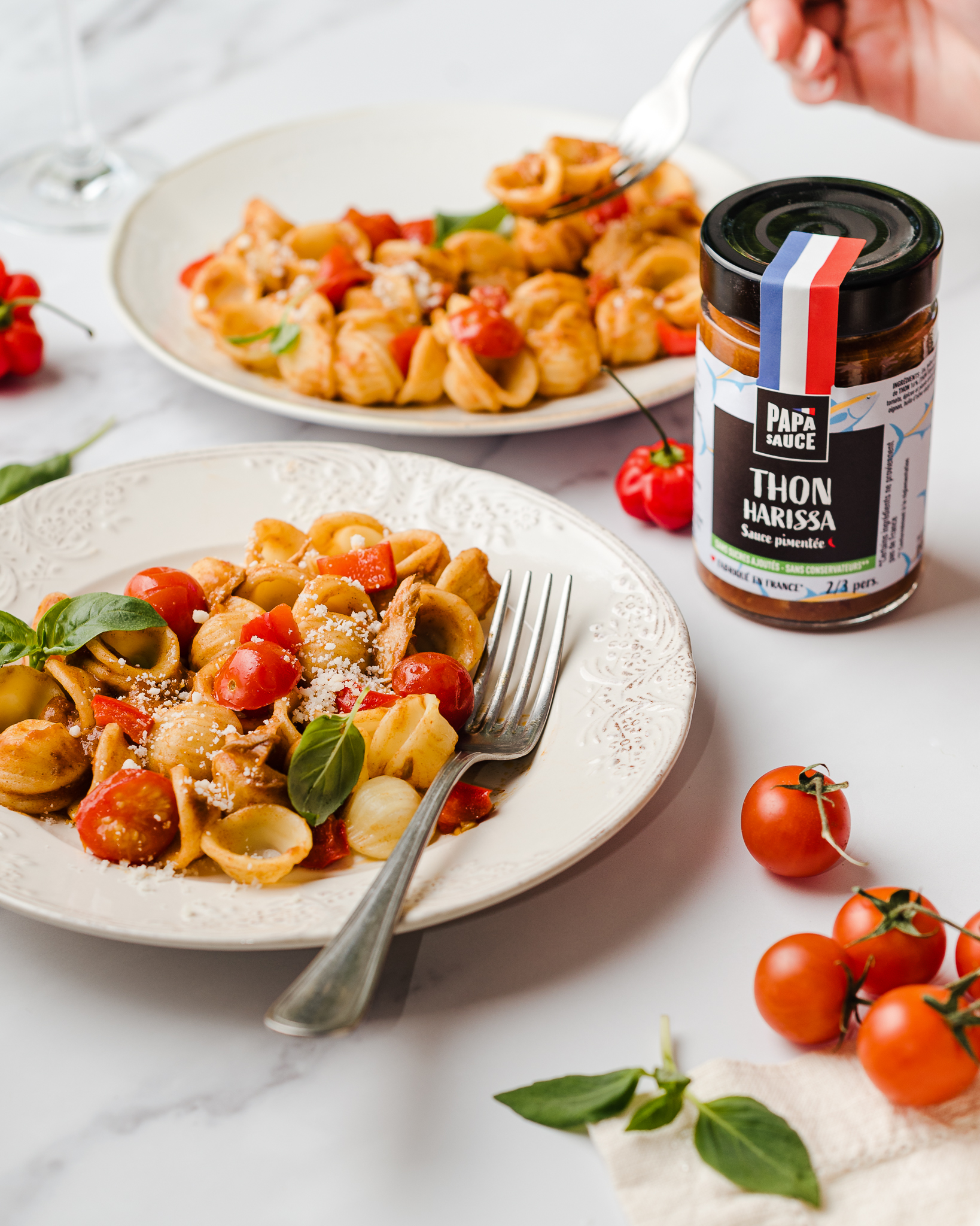 Orecchiette Thon Harissa, tomates, poivrons et basilic