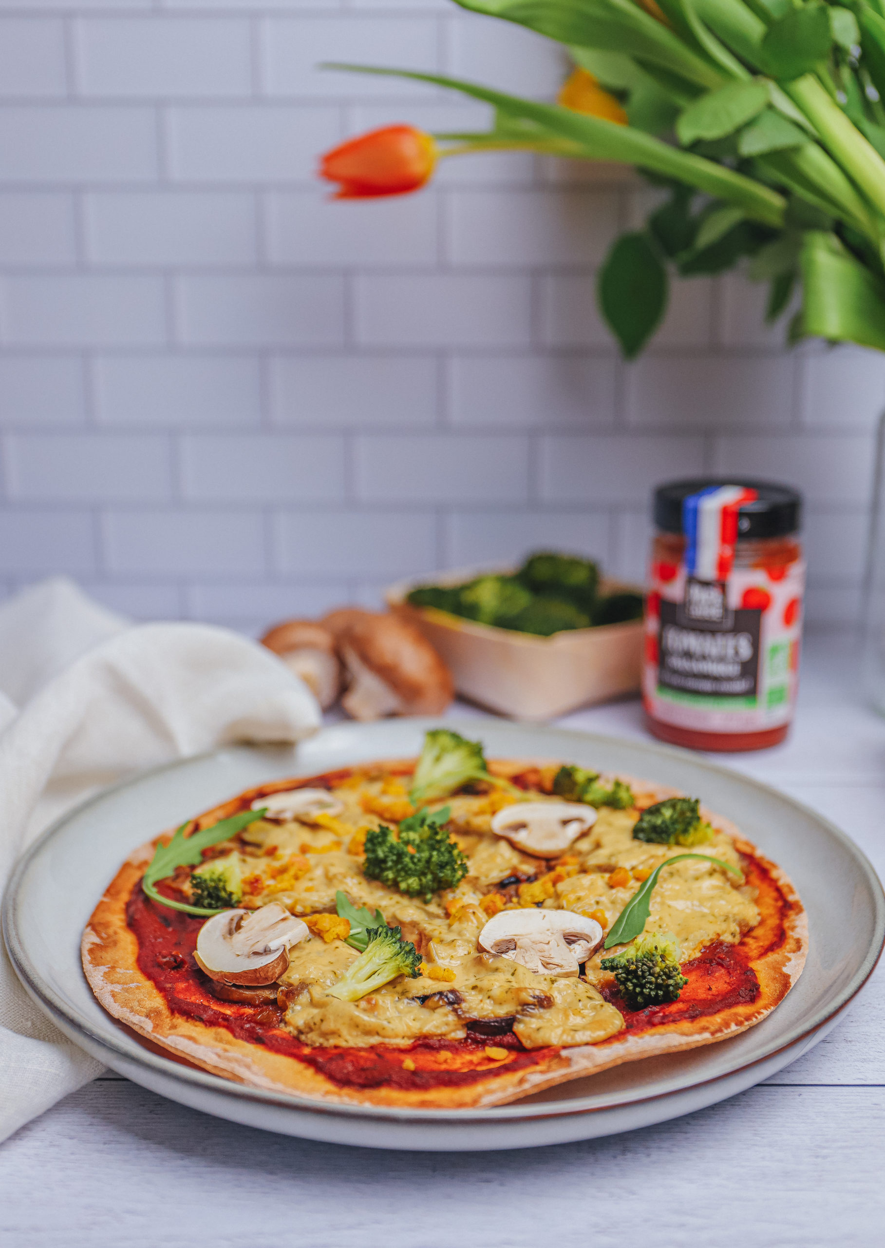 - Ajoutez la sauce tomate sur la pâte, puis les légumes et le fromage.